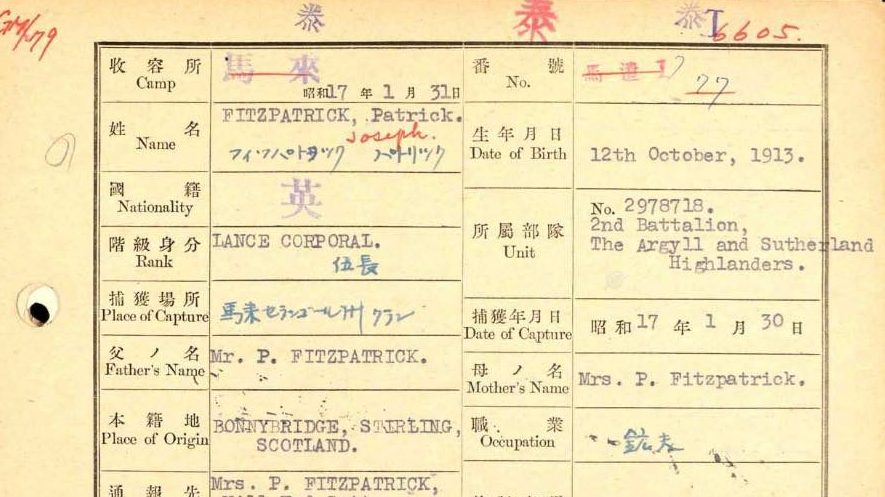 In fact, Joseph’s own brother was tragically killed while he was a prisoner of war; John. John was born in 1917, and served as an infantry private in the 2nd battalion of the Argyll and Sutherland Highlanders (A&SH). The 2nd Battalion fought ‘valiantly’ against the Japanese Army during the fighting in Malaysia and Singapore, and were one of very few British units that was prepared for the jungle warfare, earning them the nickname ‘the jungle beasts’. John was initially deployed to Malaysia, but he was reported missing on the 15th February 1942 alongside two of his brothers, Patrick and Sylvester. He was later confirmed to have been taken as a prisoner of war.
