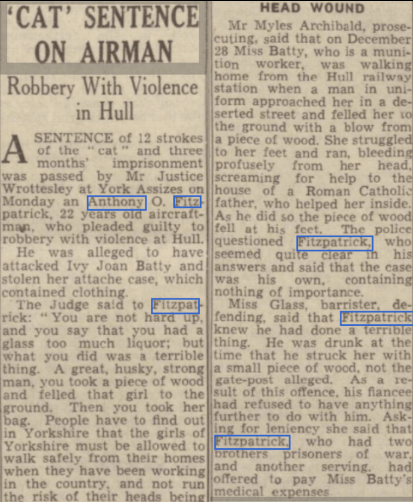 Finally, there was Anthony. As the youngest brother born in 1922, Anthony would have likely enlisted under a false name and age at only 17 years old. We know that he enlisted, but his whereabouts are very difficult to trace. He began serving as a sapper for the royal engineers within the air-force, but in early 1942 he was wounded, and his time in the forces was cut short. He likely could not face the shame of returning home to Scotland, because the next known record of him is in a newspaper in Hull, England. This paper in February 1944 details how Anthony – who had “2 brothers prisoners of war and one serving” – was sentenced to 3 months in prison and 12 lashes for attacking a woman while intoxicated and attempting to rob her. This disgrace ended his engagement with his then-fiance, and was attributed to a problem with alcoholism developed after his disrupted service. This was perhaps an early indication of the damage done to the psyche of the Fitzpatrick brothers.