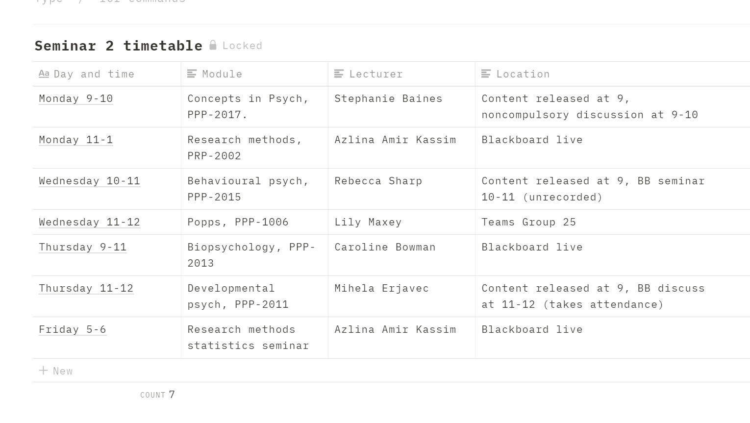 1) Write your own uni timetable. Trying to remember which module time slots are live lectures/seminars and which are asynchronous prerecorded lectures can be frustrating, so rewriting it yourself in your own words can be helpful. For this, I used notions table feature, and added it to the bottom of my dashboard for ease of access on the go. All you need is a day/time column, a module column, potentially a column for your lecturer/tutor, and then the location – which will probably just be blackboard, teams and zoom, but can also tell you whether its live, pre-recorded, attendance checked or non-compulsory.