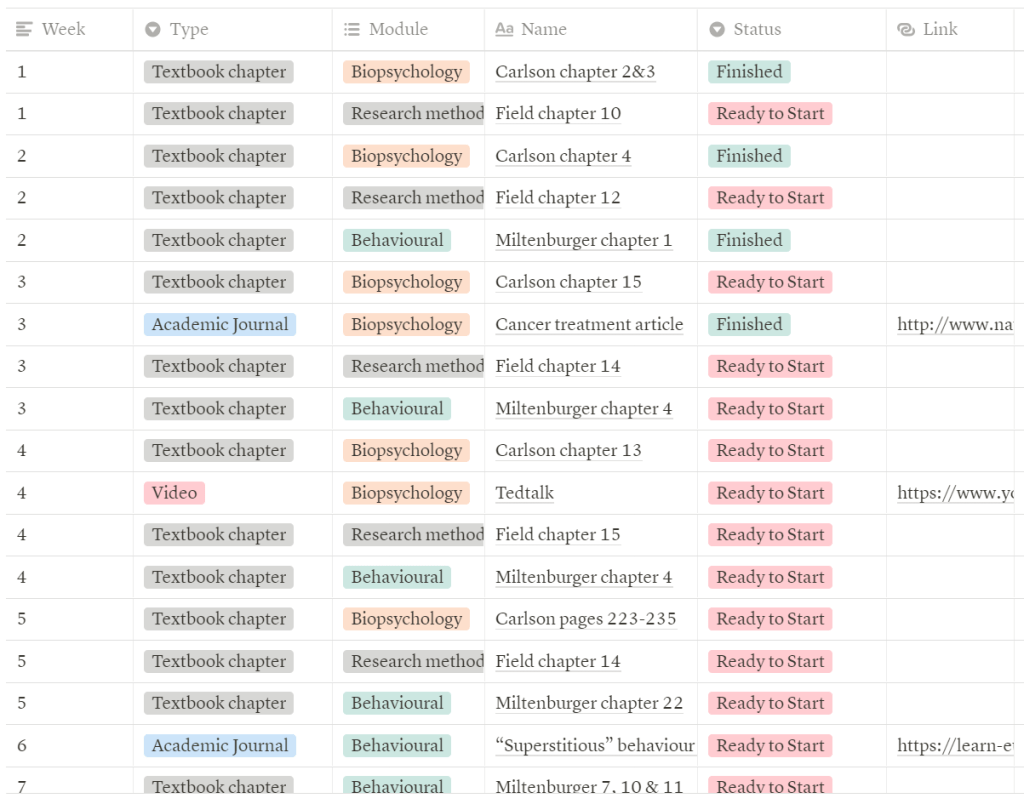 2) Compile your reading lists together into one notion table, with specific textbook chapters or article links embedded to make your access quick and easy. I set mine up so that the ‘type’ column has numerous categories to select from, as well as the module and status columns. The status column is something I particularly recommend, as you can log your progress, or whether you need to get access to the material before you can start it.