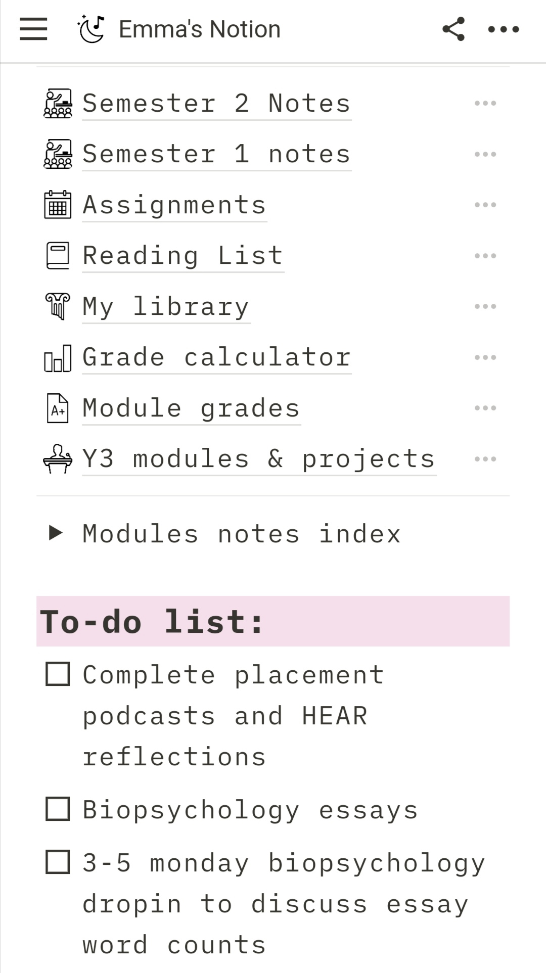 Personally, I recommend keeping separate sections on your homepage for personal pages (if you choose to include them) and university related pages, but the beauty of notion is that it’s so customisable, you can explore whichever format works for you. Now, onto the tips and tricks!