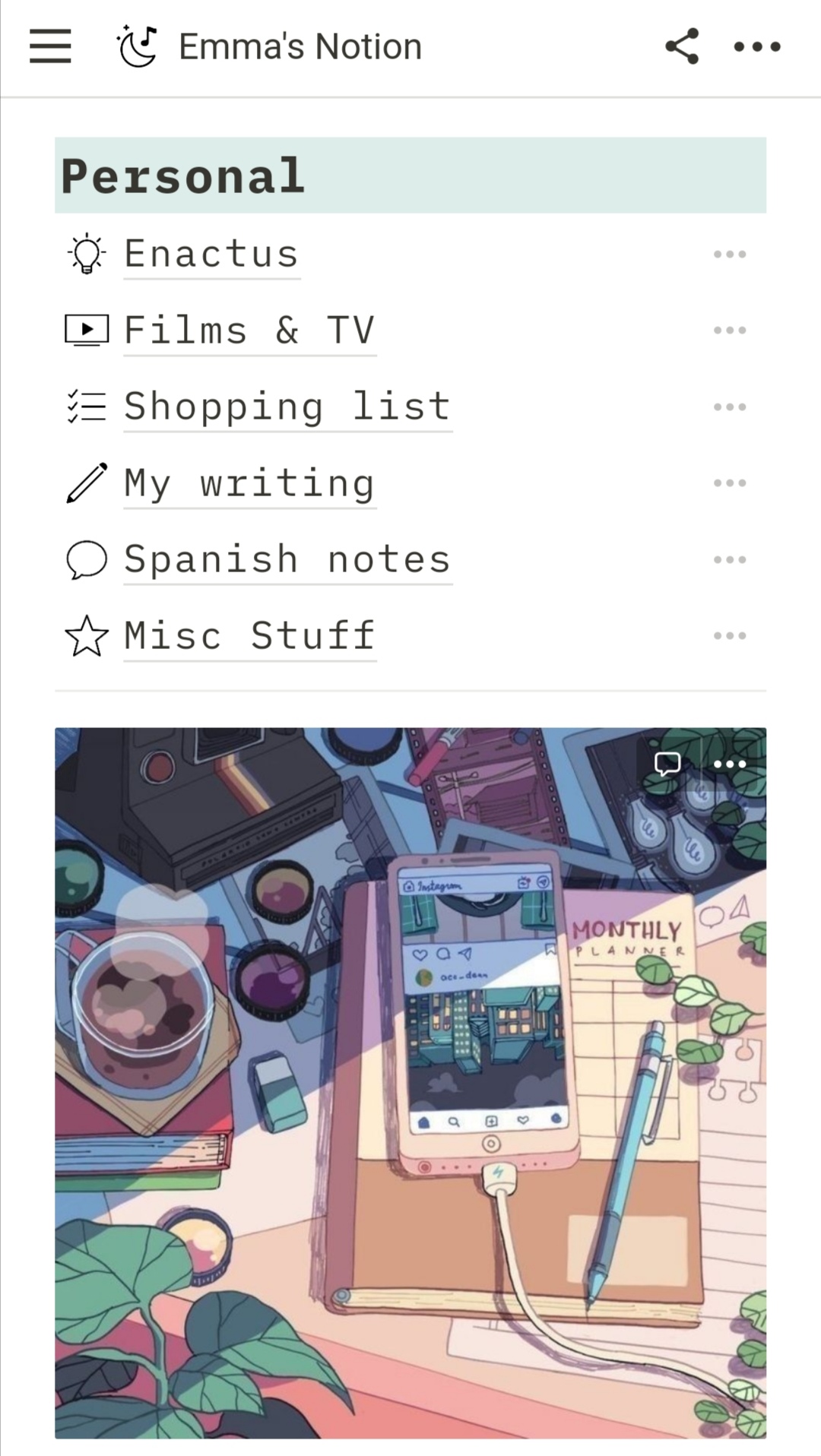 First, I’d like to introduce the app I primarily use for my organisation, which I’ll be referring back to often, called Notion. Notion describes itself as “an application that provides components such as databases, wikis, calendars and reminders. Users can connect these components to create their own systems for knowledge management, note taking, data management and project management, among others.” The app is available for mobile and desktop, so it’s accessible anywhere, but best of all; if you sign up with your academic email, you can get a free premium plan. Here’s a look at my notion homepage, from mobile. then from desktop, just to paint a clearer picture..