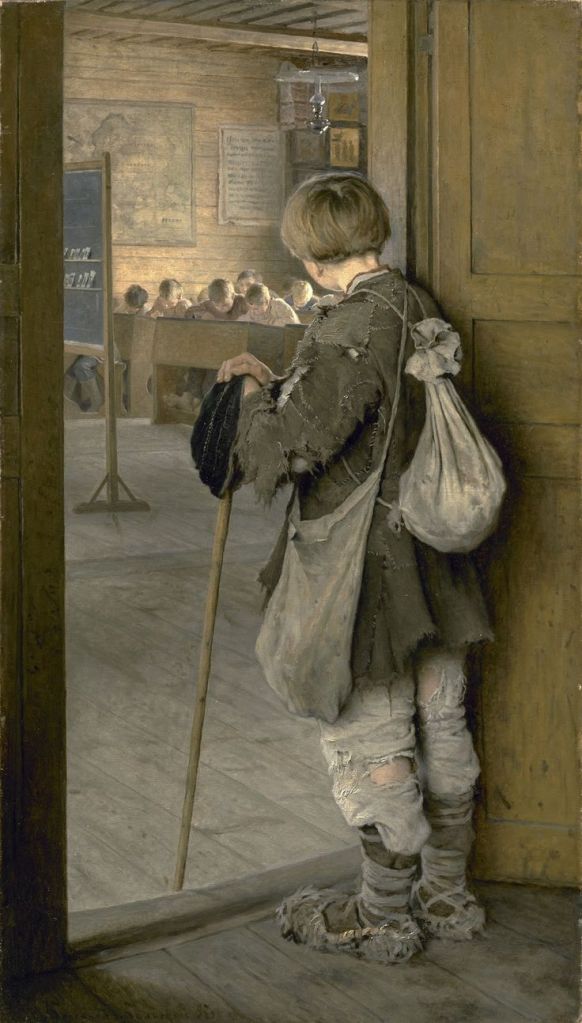 Though the subject of this painting is turned away, his body language reveals much when accompanied by historical context. The boy in ragged clothes visibly hesitates to enter a classroom, where the boys are hard at work, only one peeking at him.
