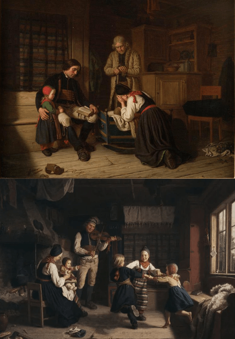 These pieces depicts the inside of a peasants cottage, inhabited by a family in Rattvik costume. In the first painting, the family mourn a deceased infant in a cradle. This first painting is a total contrast to the second, where this way of life in relative poverty is instead romanticised. The infant the woman is holding in the 2nd piece is presumably no longer living in the 1st. The fathers fur coat worn in the first painting can be seen discarded in the 2nd, too, while the curtains have been drawn, symbolising warmth and joy that is now lost to them.